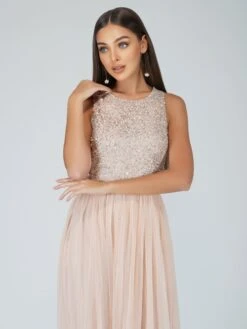 Lace & Beads Alexandra blue mesh maxi dress. This dreamy tulle gown features a v-neckline and ruffles detailing throughout in a blue-grey colour. A layered tulle dress that sweeps the flow as you walk. Make an entrance with this floor-length tulle gown. The blue occasionwear dress of your dreams. Fall in love with this romantic tulle maxi dress.