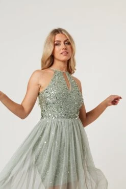 Lace & Beads Arina embellished blue gown. This dusty periwinkle dress features an elegant high neckline and is designed in a subtle mermaid silhouette. The gorgeous sequin embellishment and delicate embroidery throughout the dress create an absolute work of art, highlighting the beautiful leaf design throughout the dress. A distinctive and unique dress that is sure to have heads turn at your next event. Get red carpet ready with this embellished and embroidered blue gown.