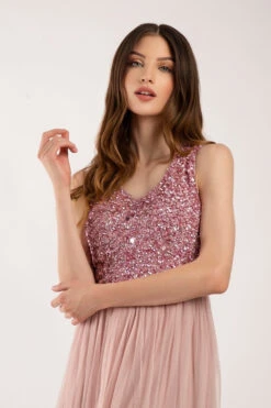 Lace & Beads Butterfly Mauve Tulle Dress – a stunning strapless tulle pink midi dress that will leave you feeling like the belle of the ball. This dress is perfect for any special occasion, from weddings to proms to formal events.