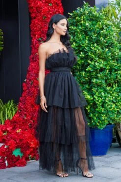 Crafted with high-quality tulle material, this tulle midi dress boasts a unique and dramatic silhouette that is sure to turn heads. The strapless design showcases your shoulders and the feminine hue of the pink tulle adds a soft and delicate touch to the overall look.