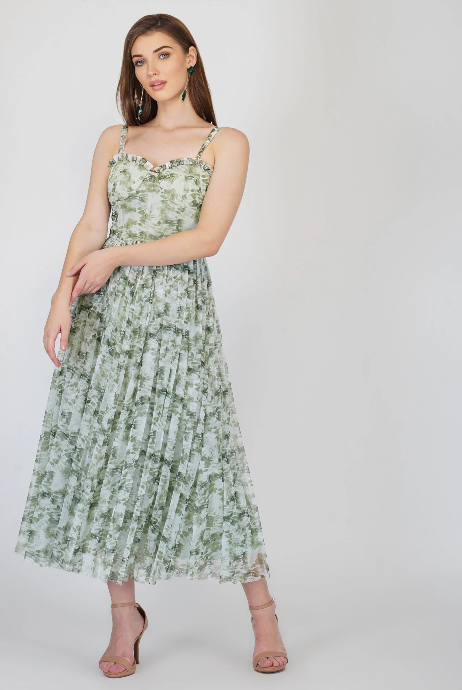 Lace & Beads Dane green printed corset midi dress. A gorgeous a-line midi dress with a tutu skirt and sweetheart neckline that has adjustable straps for a comfortable fit. This corset-style tulle dress features a beautiful green print throughout the dress. It has a trending corset style top but is finished with an elegant, feminine, flowy tulle skirt. Create a formal look with some heels as a wedding guest dress or dress it up with a leather jacket for a gorgeous night out look. This printed corset dress also looks gorgeous as a pretty tulle transitional dress a perfect addition to your Autumn wardrobe. Whether you are looking for a dress to fit your cottage-core aesthetic or just a cute Pinterest-worthy dress, this style is the perfect one for you.
