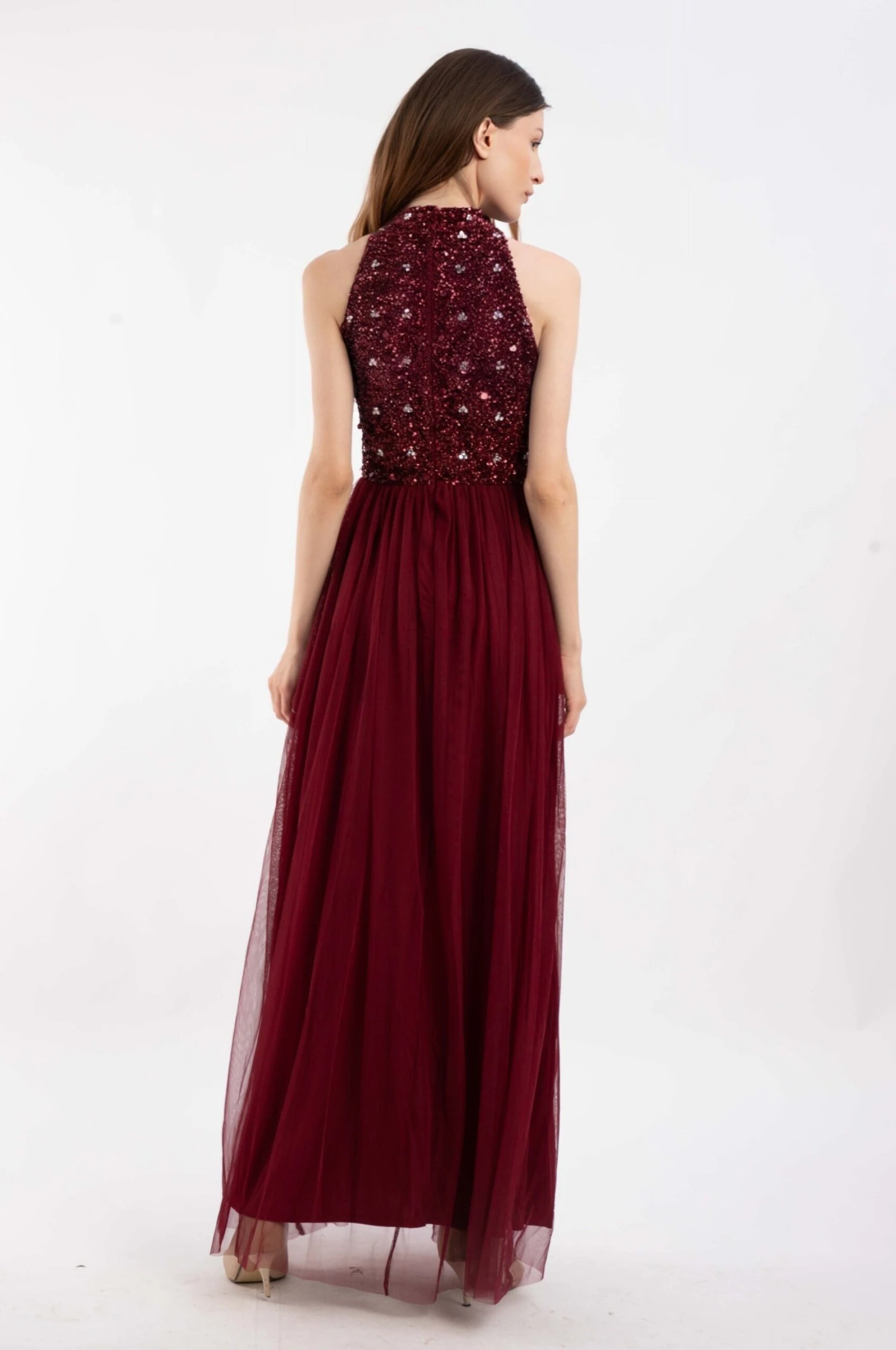 Lace & Beads Gui burgundy bridesmaid dress. This burgundy bridesmaid dress features a high neck top that is intricately embellished with complementary sequins and contrast pearl beads. The statement high neckline flows into a beautiful burgundy tulle skirt.