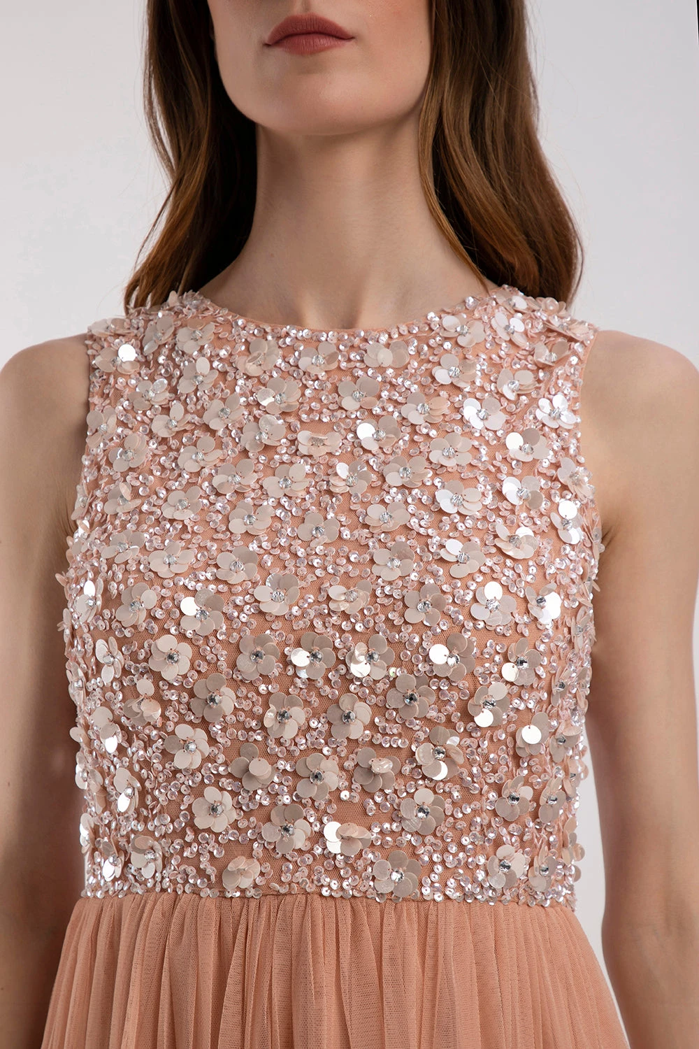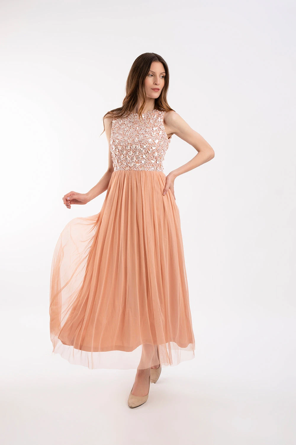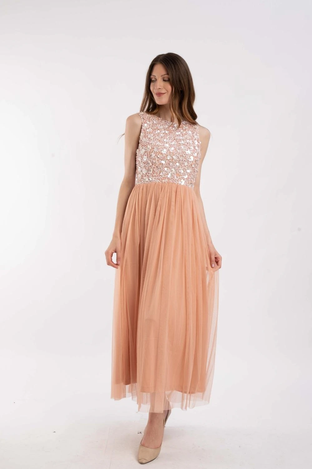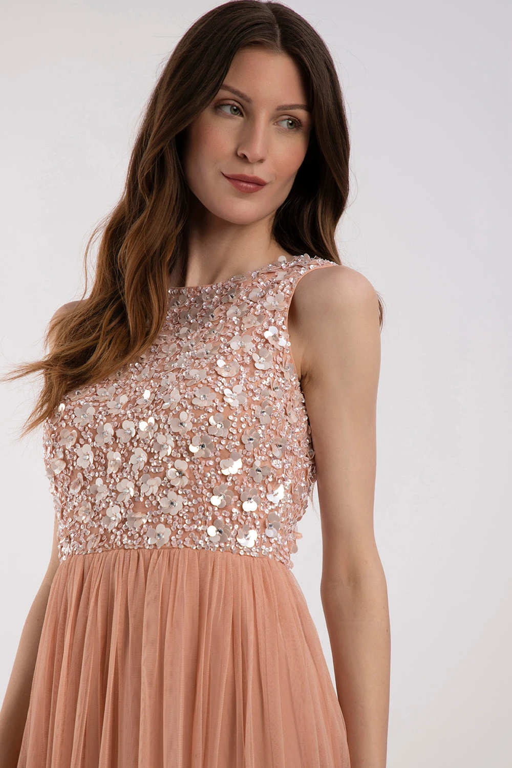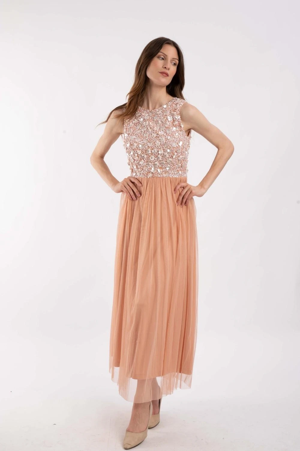 Lace & Beads Hazel embellished blush bridesmaid dress. This gorgeous blush pink maxi dress features a beautiful hand-embellished sequin top and is finsihed with a flowy lined tulle skirt for a more comfortable fit.