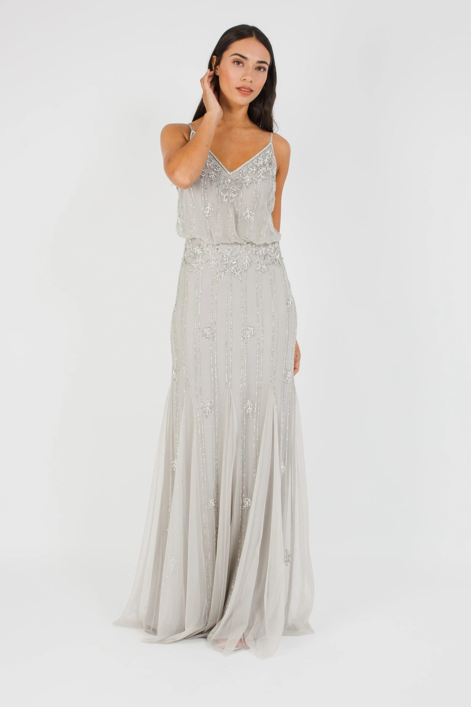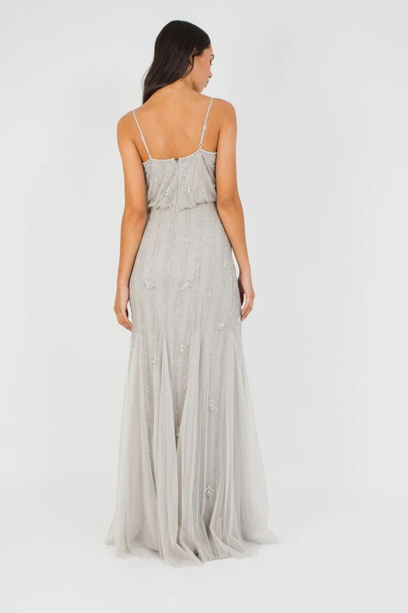 A beautifully beaded grey bridesmaid dress with spaghetti straps that can be adjusted for the perfect fit. This floor-sweeping gown features a blouson bodice with a beautiful sheer overlay. The Keeva Maxi is a unique occasionwear dress must-have with the intricately hand-embellished and gorgeous silhouette. This beautiful beaded evening dress has a fitted skirt that flows out into a slight mermaid skirt.