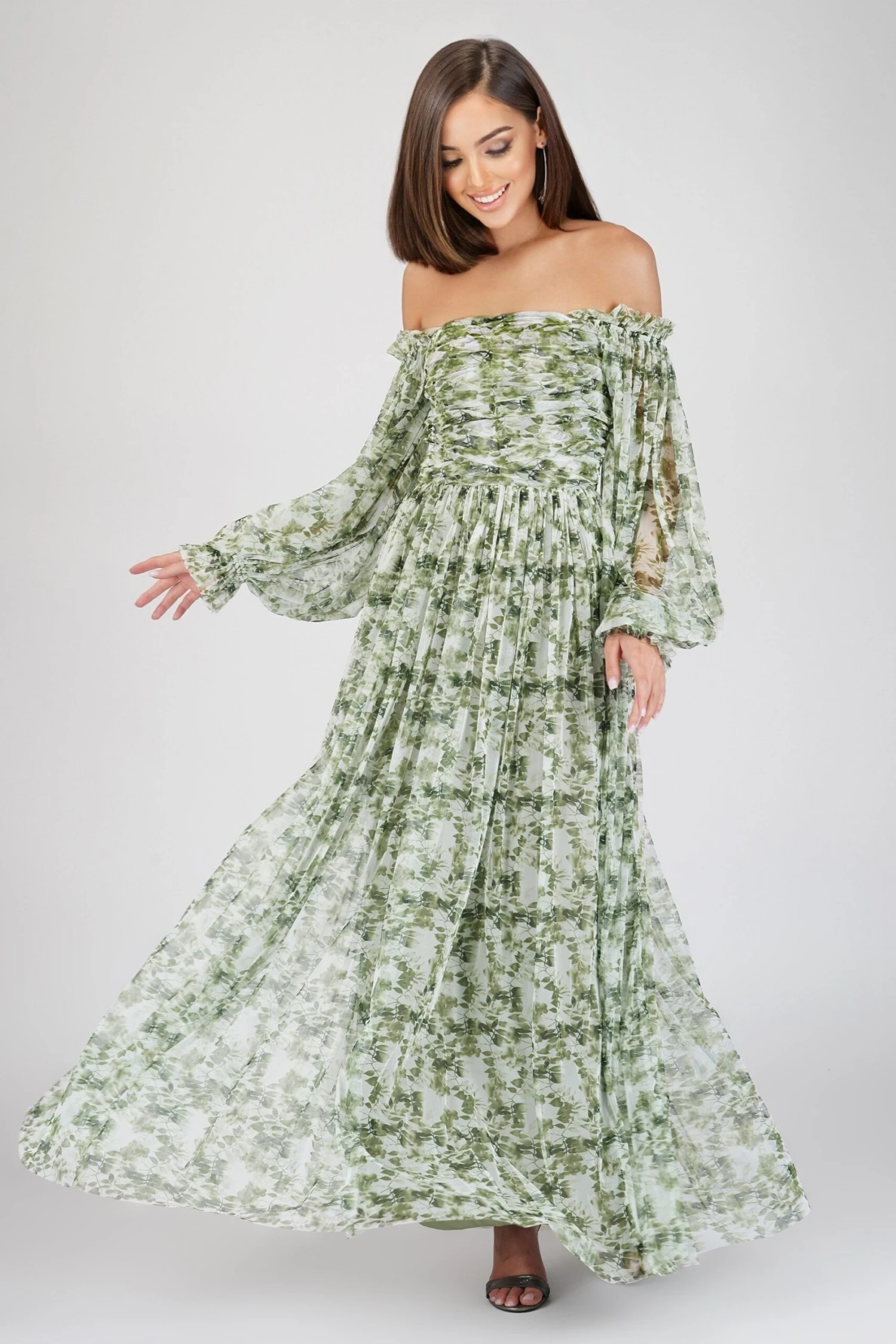 Lace & Beads Lana floral printed off-shoulder maxi dress in green. This floral tulle dress features a green print throughout, a sheer off-the-shoulder sleeve, and a flattering pleated top. It is an elegant dress that features a flattering flowing tulle skirt. We love this dress as a great option for all your special occasions. Dress it up as a green bridesmaid dress, or a green wedding guest dress, or dress it down as a green holiday dress. A versatile and beautiful green maxi dress that is sure to make an impact, whatever the occasion.