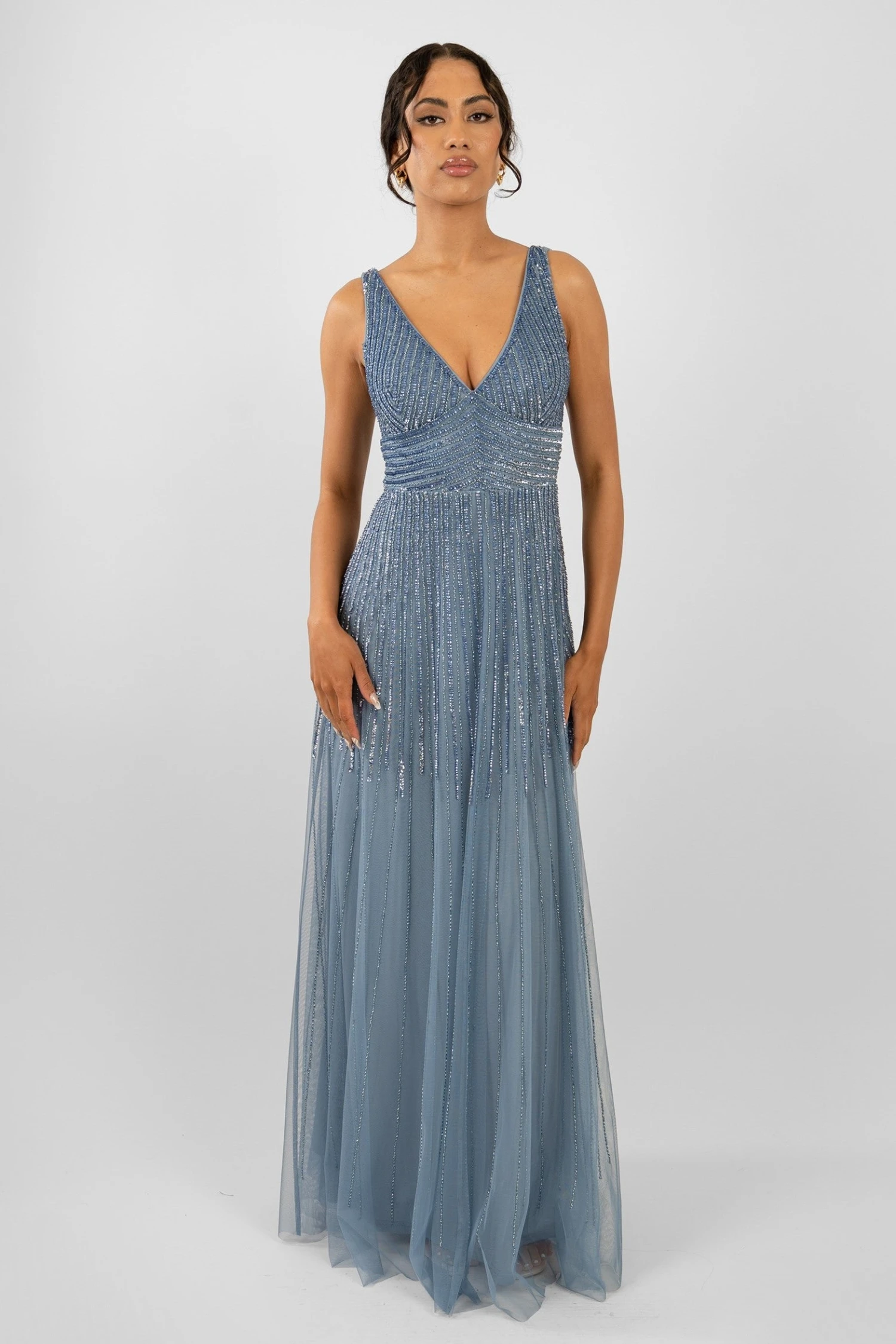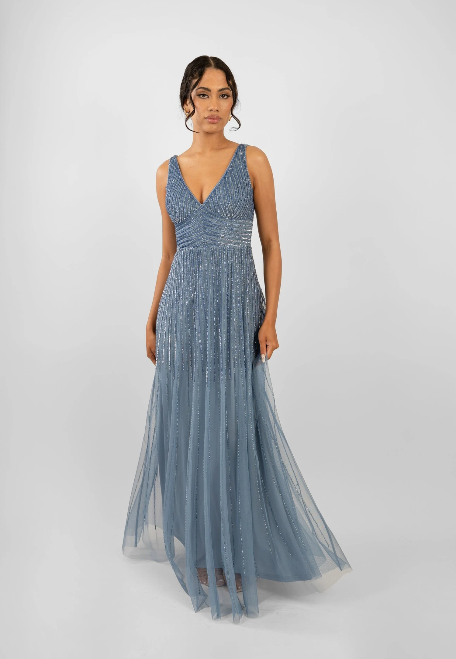 Lace & Beads Lorelai Blue Embellished Maxi Dress. This dusty blue occasionwear dress is an absolute must-have for your next occasion. It is a captivating dress that has been meticulously designed to make a lasting impression at any special event.
