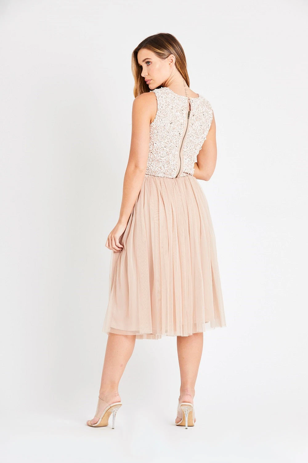 This nude beaded top is the versatile occasionwear style you need in your wardrobe. This sequin top allows you to mix and match effortlessly. Pair it with our tulle