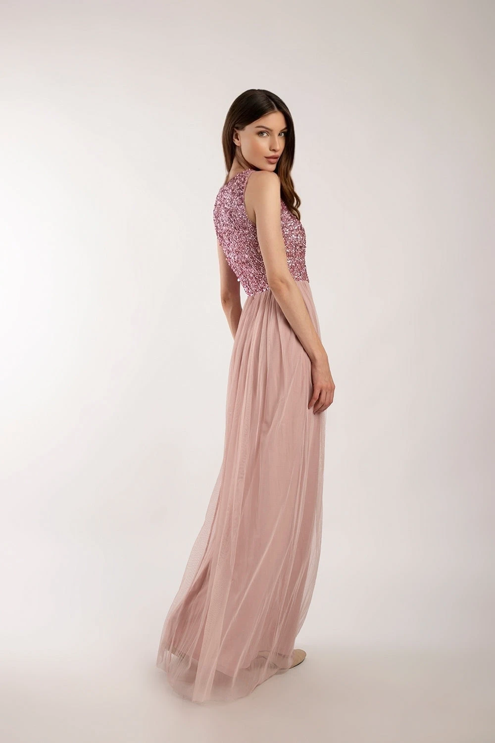 Lace & Beads Picasso V pink embellished bridesmaid dress. This dark pink bridesmaid dress has a beautiful hand-embellished sequin top with a zip-back closure. For that upcoming wedding or gala, this special occasion gown features a v-neckline, sparkling pink beading and a flowy-lined tulle skirt