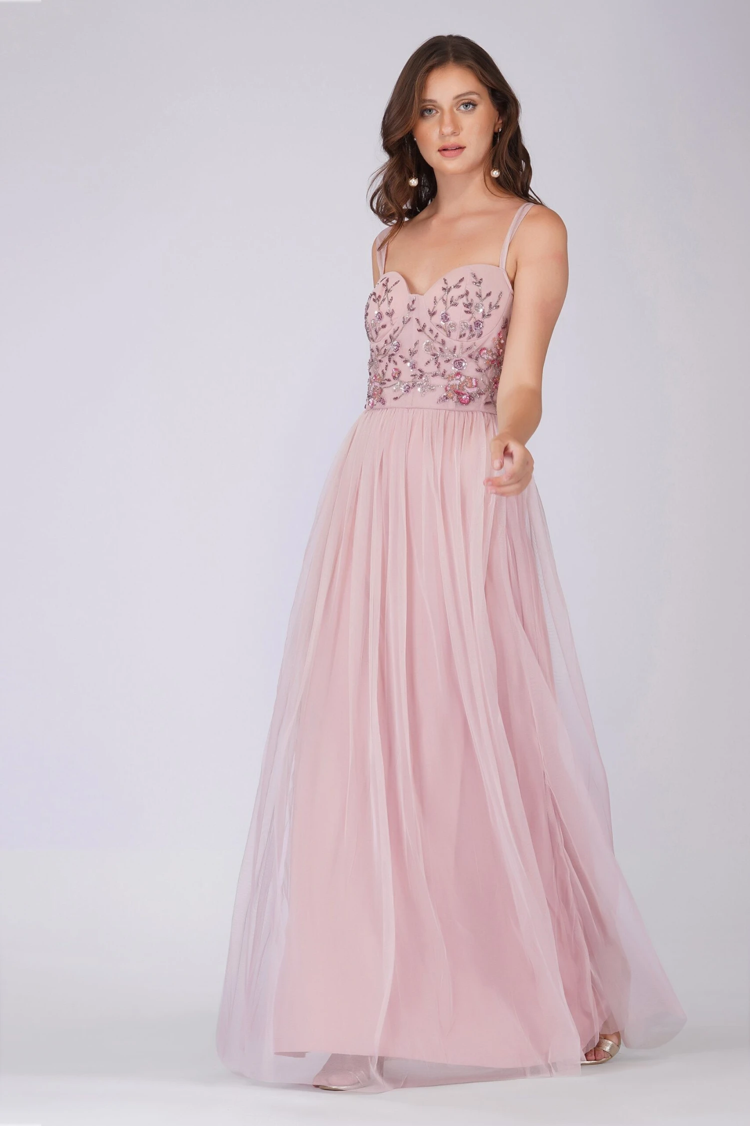 Lace & Beads Riva pink embellished corset maxi dress. A beautiful pink tulle gown that features a sequin and bead embellished top with straps that flows into an elegant a-line skirt. This occasionwear maxi dress has a trending corset style top and is finished with a feminine, flowy tulle skirt. It looks gorgeous dressed up with some heels as a pink wedding guest dress or dress it down as a garden party dress. We also love this Pinterest-worthy dress as a prom dress. Whatever the occasion the Riva tulle gown is the perfect one for you if you’re looking for a modern twist on your classic embellished gown.