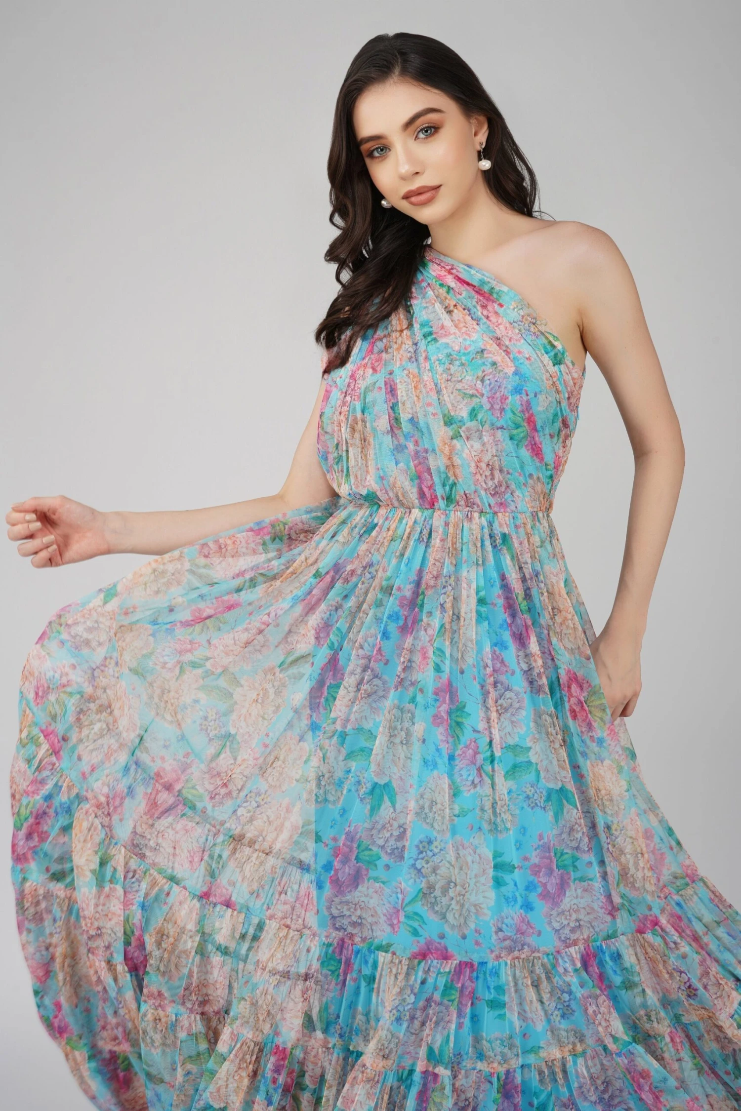.Lace & Beads Roka one-shoulder floral maxi dress. This versatile floral maxi dress features a gorgeous one-shoulder design, bringing a fresh and confident touch to your look. Its vibrant floral pattern adds a playful touch, making it perfect for various occasions, from casual events to special occasions.