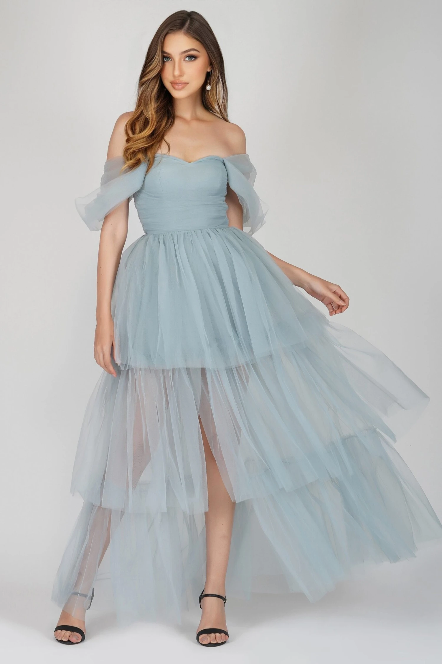 Lace & Beads Sydney teal blue tulle maxi dress. This ice blue dress features a thigh-high split, a wrapped bodice, and a shirred stretchy back for a flattering fit. Make an entrance at your next occasion with this dusty blue dress. This statement blue dress is the stand-out dress you have got to have! From the dreamy colour to the voluminous tulle skirt – this blue mesh maxi dress is the ultimate princess dress and an absolute must-have for your next occasion.
